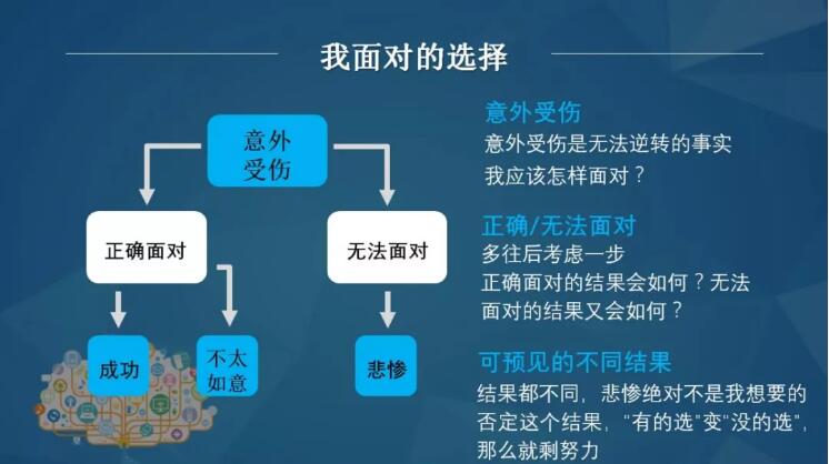 所以今天的重點(diǎn),就是學(xué)會(huì)選擇。當(dāng)時(shí)在我的面前只有兩條路。一條是無(wú)法面對(duì),這就意味著悲慘生活。當(dāng)時(shí)通過(guò)那個(gè)小手機(jī),跟很多像我這樣受傷的老傷友、老病友交流之后,我發(fā)現(xiàn)了很?chē)?yán)重的問(wèn)題。像我們這種下半身沒(méi)有感覺(jué)的病人,躺在床上很有可能發(fā)生褥瘡這種并發(fā)癥,有些人的褥瘡深可見(jiàn)骨,褥瘡感染就容易導(dǎo)致敗血癥,甚至死亡,而其他的后遺癥并發(fā)癥也還有很多。對(duì)于我來(lái)說(shuō),看到那個(gè)深可見(jiàn)骨的褥瘡,我就認(rèn)為這是悲慘的生活,而我不愿變成那樣,所以我要正確面對(duì)。正確面對(duì),之后無(wú)非就是不太如意,但是至少不會(huì)是悲慘。那我為什么不正確面對(duì)呢?而且正確面對(duì),還有可能成功。