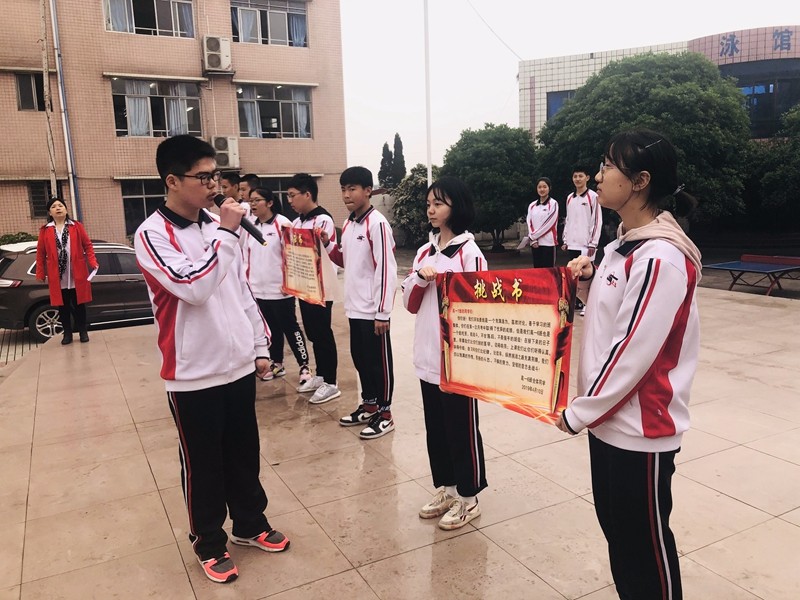 挑應(yīng)戰(zhàn)正式開始,文理科班班長分兩批次上臺,分別向自己挑戰(zhàn)或應(yīng)戰(zhàn)的班級宣讀了挑戰(zhàn)書或應(yīng)戰(zhàn)書?!罢l英雄,誰好漢,每次考試比比看!”“文者稱雄,武者稱霸;唯我五班,雄霸天下!”……各班戰(zhàn)書或鋪成排比,或古文寫就,氣勢磅礴,文采斐然。同學(xué)們更是士氣高昂,信心百倍,不甘示弱。