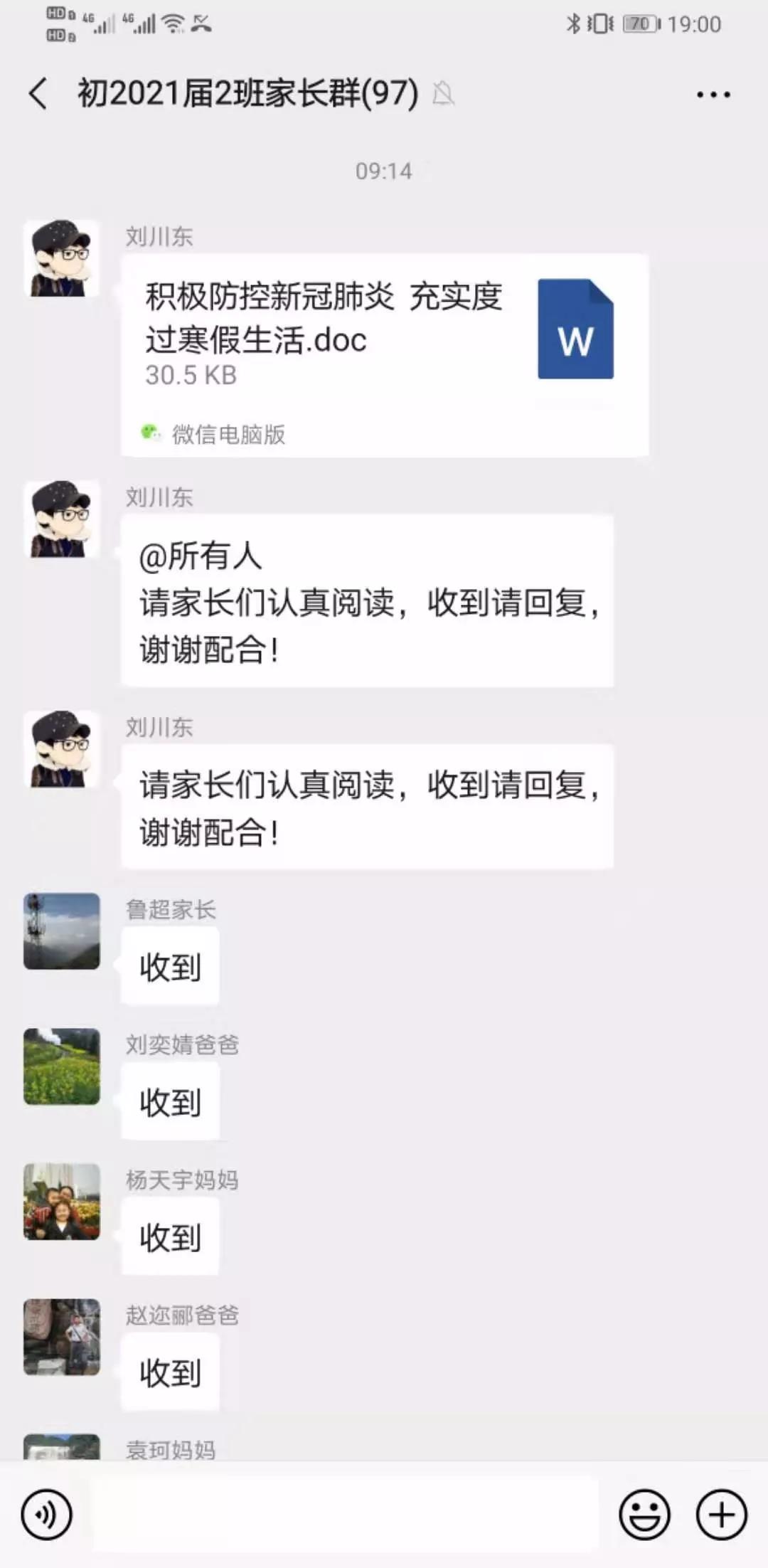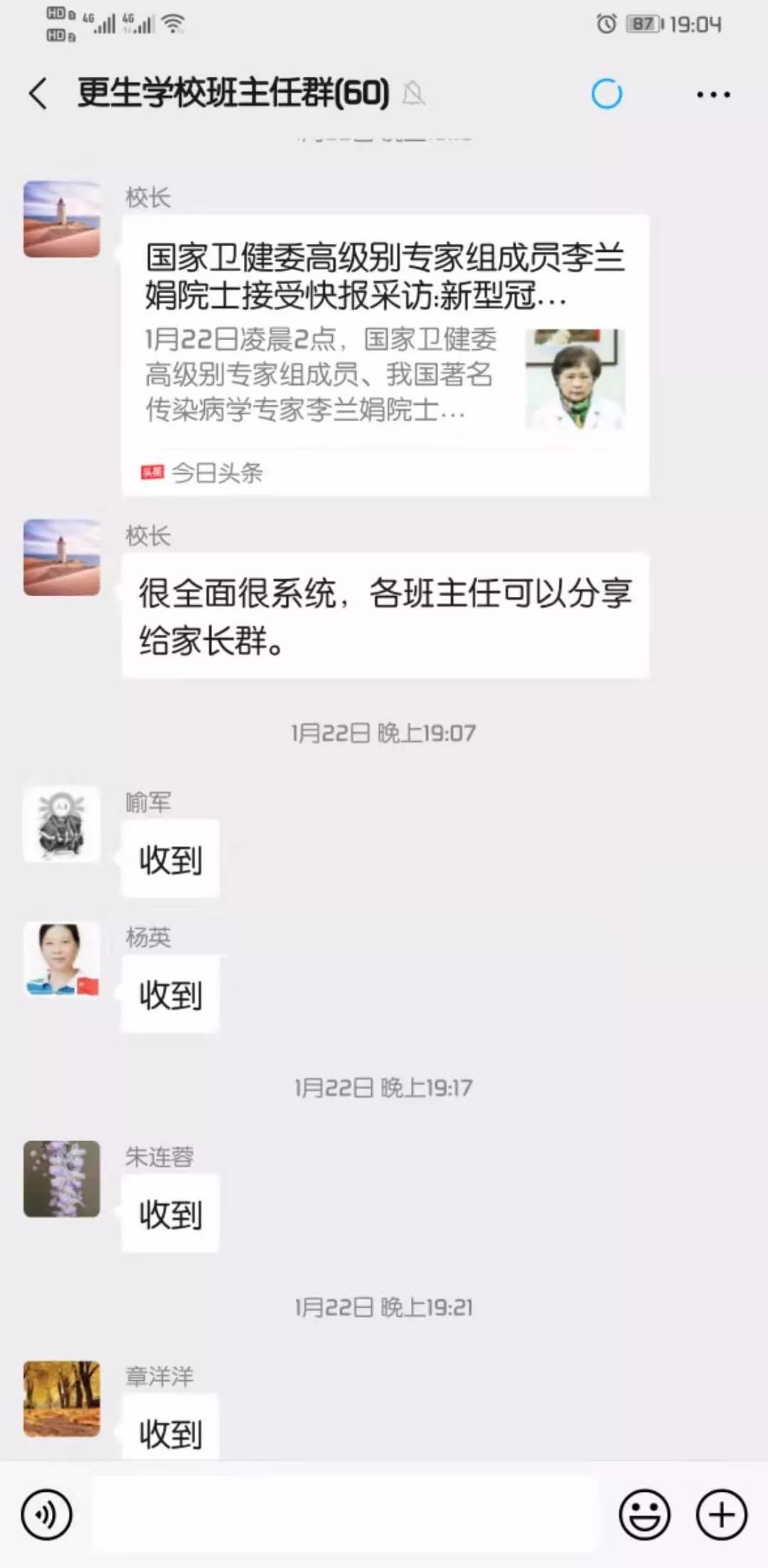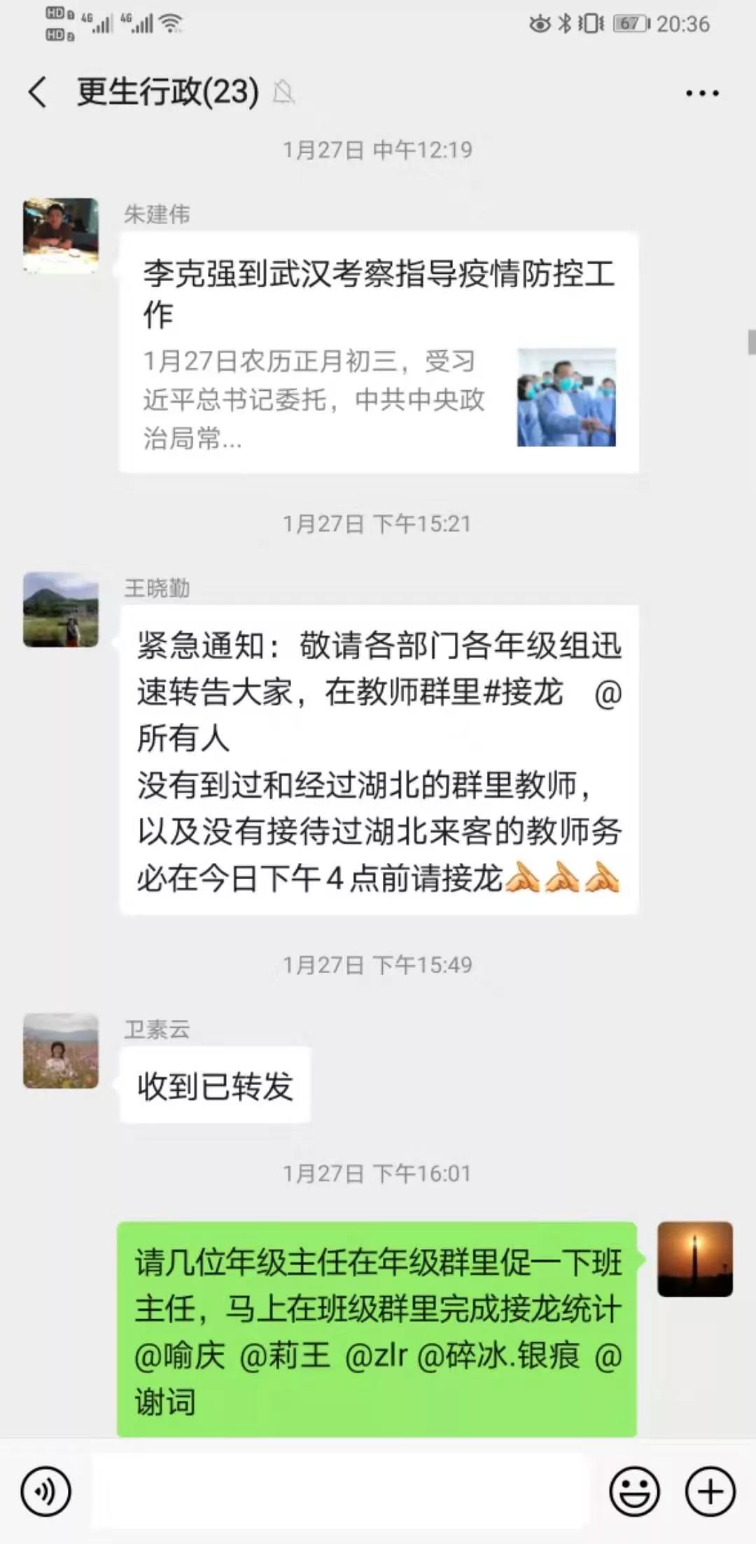 積極利用學(xué)校部門微信群、班主任工作群、教室工作群、班級微信群等進(jìn)行信息溝通和疫情防控宣傳、學(xué)生假期學(xué)習(xí)生活指導(dǎo)等工作。