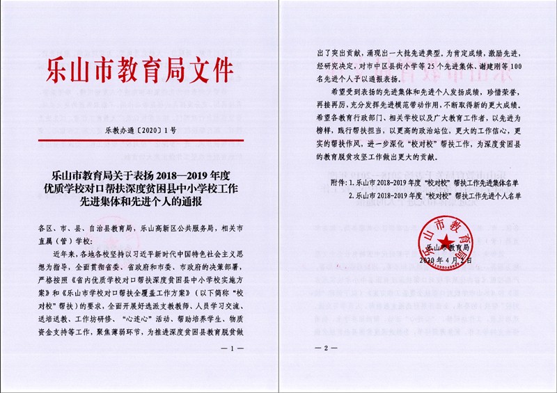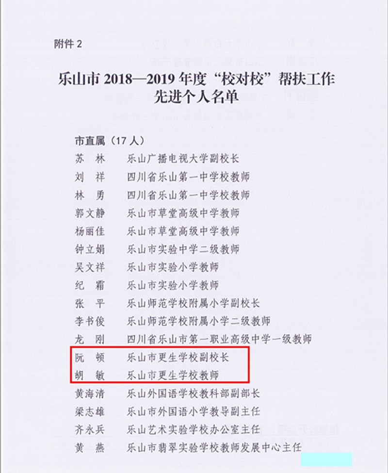 2020年4月,更生學(xué)校教師阮頓和胡敏在2018—2019年度優(yōu)質(zhì)學(xué)校對口幫扶深度貧困縣中小學(xué)校工作中做出貢獻(xiàn),被樂山市教育局評為先進(jìn)個人。