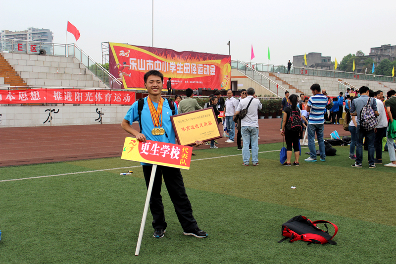 國歌奏響,紅旗飄揚。2013年3月30日至31日樂山市中小學生田徑比賽在峨眉一中順利舉行,由各區(qū)縣、各市直屬學校組成的15支代表隊,在運動場上激烈角逐。更生學校代表隊在運動員較少的情況下,在比賽過程中包攬男子中長跑全部金牌:包括男子800米(林培成)、1500米(碾者阿提)、5000米(碾者阿提)該項目打破了市記錄。在男子接力賽上取得我校歷史最好成績,獲得4×100米第四名、4×400米第五名,創(chuàng)造了更生學校新的紀錄。在市中區(qū)參賽的5支高中代表隊當中,更生學??偡峙琶谝?。在閉幕式中,峨眉山市教育局副局長黃光君,對在本屆運動會上唯一打破市紀錄的更生學校學生(碾者阿提)給予了通報表揚,獲得會上雷鳴般掌聲。