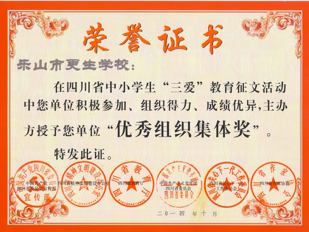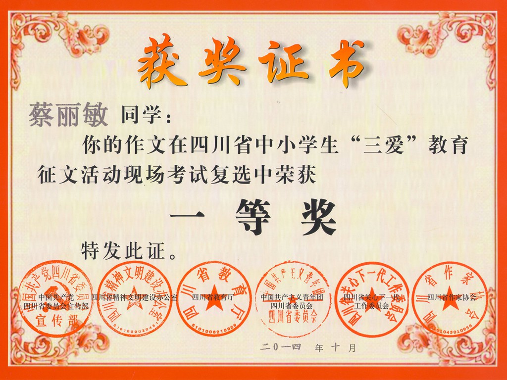 在今年上半年舉行的四川省中小學生“三愛”教育征文活動中我校積極組織學生參加比賽,在上半年的征文初選活動中我校選送了150余篇文章參加評選,有10位同學獲一等獎,19位同學獲二等獎,29位同學獲三等獎。在10月舉行的復選中我校有3位同學參加了現(xiàn)場考試,其中高中組蔡麗敏同學以第一名的成績獲唯一一個一等獎。我校組織得力,成績優(yōu)異,近日被四川省中小學生“三愛”教育征文活動主辦方授予“優(yōu)秀組織集體獎”,蔡麗敏同學的指導教師陳勁松老師獲得優(yōu)秀指導教師獎。(文/王佳秀)
